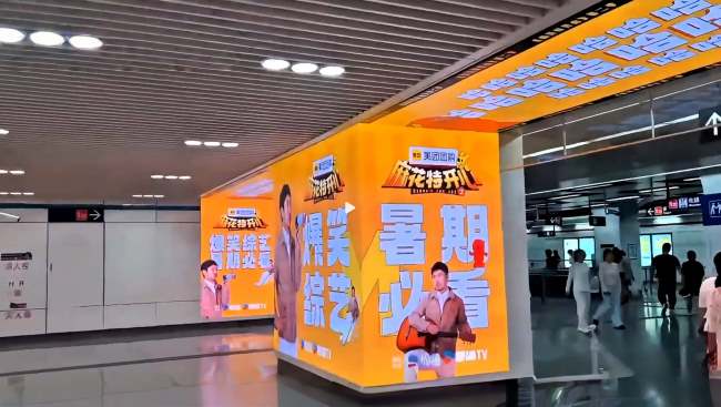 杭州地鐵濱康路站換乘通道墻面超長LED大屏廣告位于單側(cè)墻面,結(jié)合包柱大屏,形成了一個總面積達(dá)228平方米的連續(xù)視覺陣列。這一超大尺寸的展示面積在相對封閉的通道環(huán)境中具有強(qiáng)烈的視覺沖擊力,能夠有效吸引乘客注意力。其次,廣告位位于乘客換乘的必經(jīng)動線上,確保了信息能夠覆蓋所有換乘人群,實現(xiàn)了高效觸達(dá)。高頻次的播放能夠?qū)Τ掷m(xù)流動的換乘客流進(jìn)行反復(fù)提示,有助于強(qiáng)化品牌印象。超長屏幕與包柱組合的媒體形式,還在通道內(nèi)創(chuàng)造了環(huán)繞式的視覺體驗,提升了品牌展示的整體性。