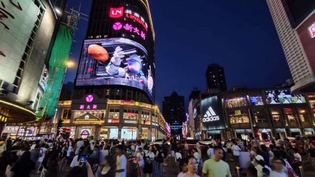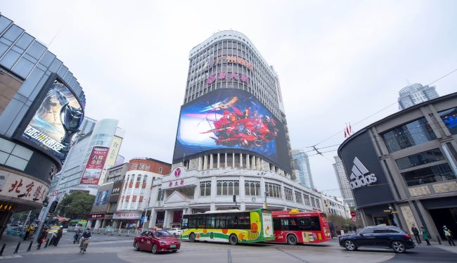 廣州北京路步行街新大新大廈外墻LED廣告大屏1196.24平方米弧形巨幕位于樓體高處形成仰視視覺壓迫感,屏體21.12米高度與建筑立面完美融合?;⌒卧O計增強視覺縱深,150米外仍保持畫面完整辨識度,夜間播放時成為商圈視覺焦點。正對北京路與中山五路交叉口,同步覆蓋步行街人流與車行動線,弧形曲面實現(xiàn)160°視野范圍,消除直角屏視覺盲區(qū),確保各方向客流均能獲取最佳觀看視角。