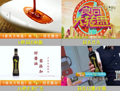 形式:頻道設計統(tǒng)一識別的標版,內(nèi)含企業(yè)5秒無聲畫面廣告(廣告畫面占屏幕的2/3),畫框下方出現(xiàn)“本欄目指定產(chǎn)品由***提供”字樣。配音內(nèi)容:《食尚大轉盤》欄目指定用品由***(企業(yè)名稱)提供。 |