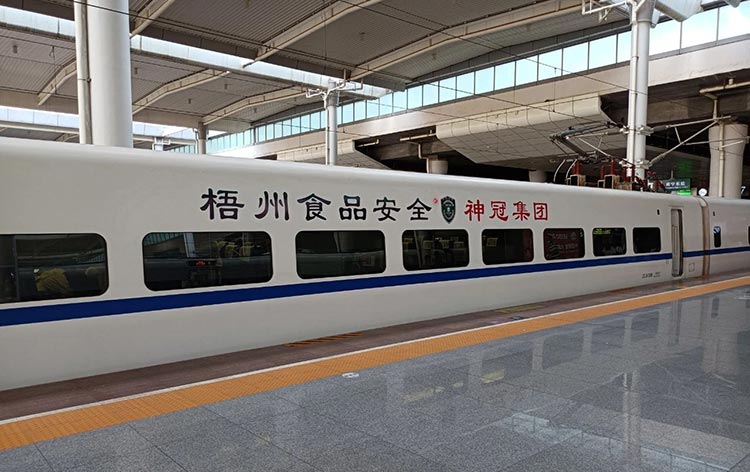 梧州食品安全專列以梧州為中心,途經(jīng)南寧、貴港、桂平、肇慶、佛山、廣州等城市及各縣10個車站,并輻射粵桂黔川渝等區(qū)域,每周影響旅客約3萬人次。裝點著梧州食品企業(yè)品牌形象的高鐵專列,在南廣鐵路沿線各個城市飛馳穿梭,助力梧州特色食品加速駛?cè)肱畈l(fā)展的“快車道”。