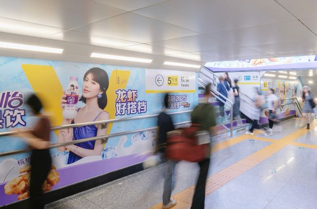 長沙地鐵萬家麗廣場站換乘品牌通道廣告覆蓋2號(hào)線轉(zhuǎn)5號(hào)線、5號(hào)線轉(zhuǎn)2號(hào)線雙向客流。2塊梯眉燈箱位于樓梯正上方,乘客仰視上下樓梯時(shí)視線自然鎖定,單次閱讀時(shí)長 5-8秒;55㎡雙側(cè)墻面貼形成“視覺長廊”,雙邊樓梯立面貼沉浸覆蓋,乘客步行通過全程持續(xù)接觸廣告,總曝光時(shí)長 40-60秒/人次。立體視覺包圍、動(dòng)線無遺漏觸達(dá)、場景化閉環(huán)轉(zhuǎn)化等優(yōu)勢在乘客消費(fèi)決策關(guān)鍵節(jié)點(diǎn)實(shí)現(xiàn)深度滲透?!氨亟?jīng)過道+商圈直連”屬性特別適合快消、零售、文旅及本地生活品牌。