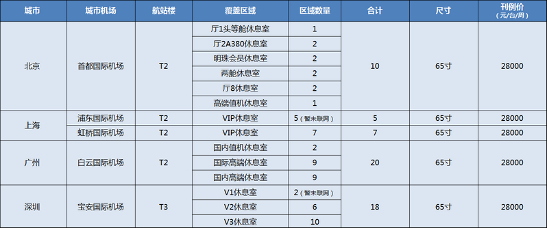 1.按機場收取上刊服務(wù)費,1500元/次/機場,每增加或更換一次發(fā)布內(nèi)容,將相應(yīng)加收一次上刊服務(wù)費; 2.提前10個工作日提供上刊物料,畫面要求為JPG文件,寬1080像素x高1920像素,精度要求72DPI; 3.視頻廣告上刊單次另加500元/次/臺的服務(wù)費用; 4.23個城市24位機場,其中上海覆蓋浦東國際機場及虹橋國際機場。 |