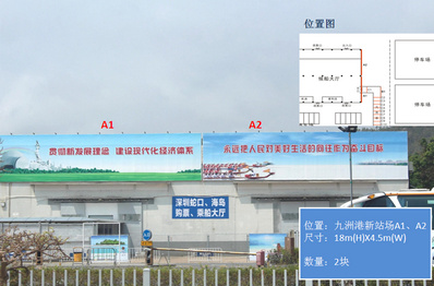 媒體位置:九洲港新站場(chǎng)大牌 媒體規(guī)格:A1、A2尺寸均為18*4.5米 客流量達(dá):30多萬(wàn)人次/日 車流量達(dá):25多萬(wàn)輛次/日 媒體報(bào)價(jià):70萬(wàn)元/年