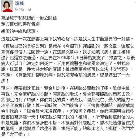 日前,臺灣知名作家瓊瑤在Facebook公開了一封致兒子兒媳的信,以不容置疑的口吻表達(dá)了對自己死亡的安排。