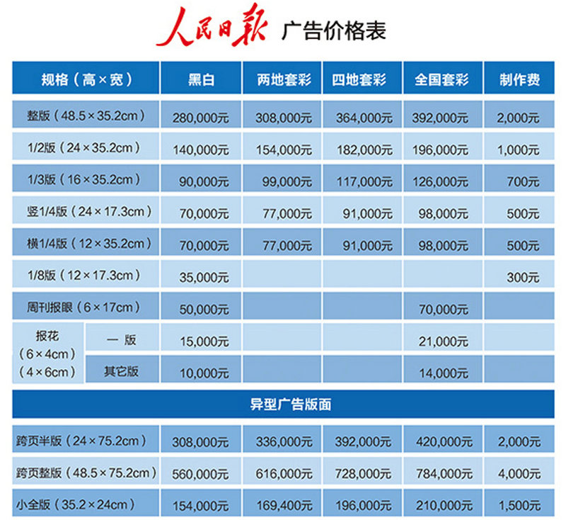 10. 從數(shù)萬(wàn)元的豆腐塊廣告,到最高78萬(wàn)元/期的整版異形廣告,雖然都說(shuō)紙媒式微,但人民日?qǐng)?bào)的廣告價(jià)格還是這么高傲!自認(rèn)為牛逼閃閃的華盛頓郵報(bào)的價(jià)格也才77萬(wàn)元/期(美元11.45萬(wàn)元)。