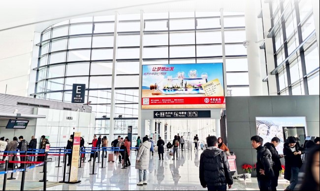 寧波機(jī)場(chǎng)T2出發(fā)辦票大廳左右側(cè)墻面高空燈箱廣告燈箱離地超5米,規(guī)避人流遮擋,旅客平視或仰視均可清晰接觸畫(huà)面。其位于T2通往T1通道口上方,覆蓋跨航站樓中轉(zhuǎn)客流,進(jìn)一步擴(kuò)大觸達(dá)范圍。單塊52.34㎡的巨幅畫(huà)面在開(kāi)闊大廳中形成視覺(jué)地標(biāo),雙屏左右兩側(cè)各一塊強(qiáng)化品牌存在感,適配中遠(yuǎn)距離識(shí)別。旅客辦票平均停留15-30分鐘,處于相對(duì)空閑狀態(tài),對(duì)周邊信息接收度高;大廳空間減少外部干擾,旅客視線自然掃視墻面及通道,燈箱恰處視覺(jué)動(dòng)線焦點(diǎn),形成低干擾、高觸達(dá)的傳播環(huán)境