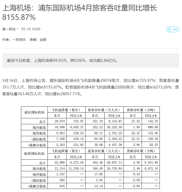 【上海機場:浦東國際機場4月旅客吞吐量351.7萬人次】上海機場公告,浦東國際機場4月飛機起降量29074架次,同比增長725.97%;旅客吞吐量351.7萬人次,同比增長8155.87%。虹橋國際機場4月飛機起降量22880架次,同比增長6273.26%;旅客吞吐量363.46萬人次,同比增長28057.71%。