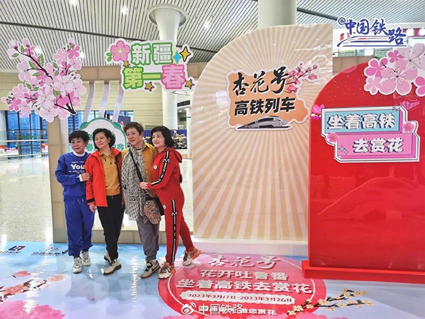 為方便旅客坐“杏花號”高鐵列車廣告動車出行,烏魯木齊站、吐魯番北站開辟了“杏花號”列車進出站綠色通道。烏魯木齊客運段乘務人員提前精心布置列車車廂,并設計了豐富的互動活動,為出游旅客打造了溫馨、舒適、愉快的旅途。