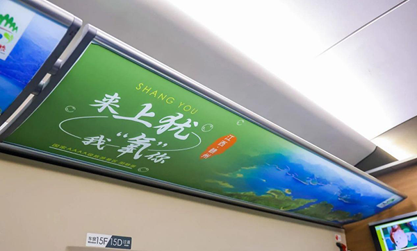 在列車內(nèi),隨處可見“來上猶我‘氧’你”的上猶文旅元素,讓乘客近距離感受到美麗上猶的魅力。