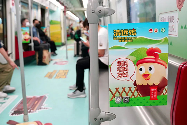 廣州地鐵3號線“清城區(qū)清遠雞”專列廣告,每天可裝載約3.5萬人次,宣傳周期內(nèi)將達約98萬人次。列車兩側(cè)車門貼廣告、車窗貼廣告、地板貼廣告等配以清遠雞的卡通IP形象與實物圖片讓車內(nèi)乘客紛紛拍照打卡。廣州地鐵車廂廣告上的二維碼也可以直達購買界面。