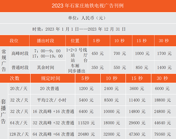石家莊地鐵電視廣告刊例價格