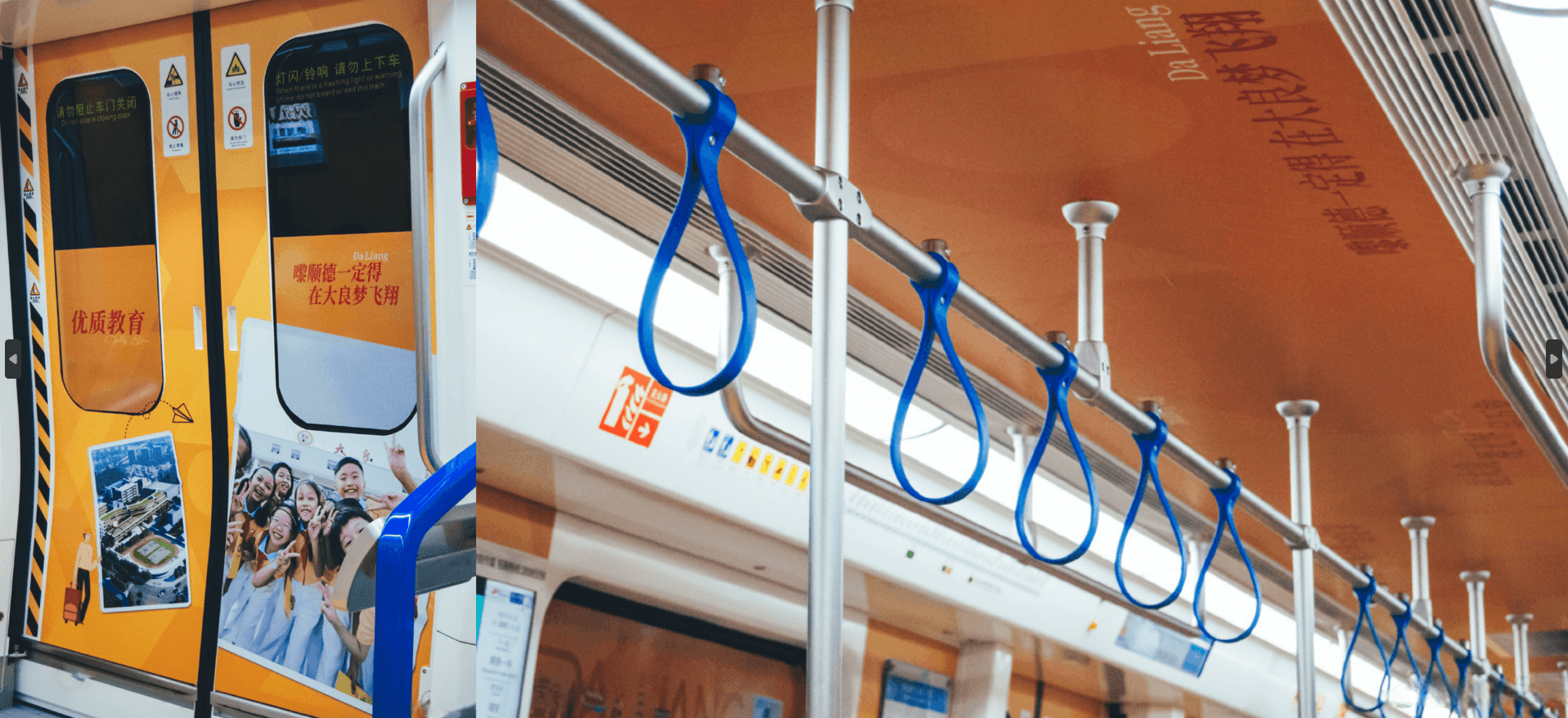 全仔今天帶來的佛山地鐵3號(hào)線內(nèi)包車廣告案例來自佛山市順德區(qū)大良街道‘水韻鳳城 品質(zhì)大良’主題列車,本次佛山地鐵主題列車廣告通過地鐵包天包地6節(jié)車廂,用最亮眼的橘黃色海報(bào)向乘客講述大良特色美食、旅游、教育等元素。除了經(jīng)典的清暉園、雙皮奶、鐘樓等知名項(xiàng)目,還有順峰山公園長(zhǎng)鹿農(nóng)莊等景點(diǎn)等待乘客與市民朋友探索。歡迎搭乘佛山地鐵3號(hào)線大良主題列車來順德大良!