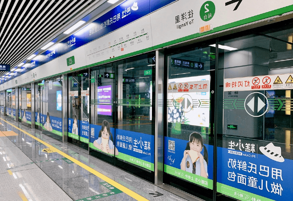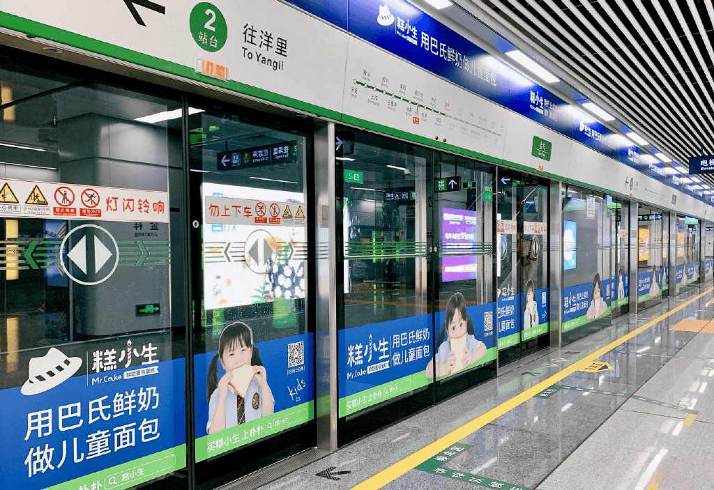福州地鐵2號線金祥站是A++級別站點,緊鄰S+級別2號線和5號線換乘站的金山廣場站,周邊分布有政府辦公區(qū)、金山中學(xué)、榕城廣場、金山體育場以及若干高端住宅區(qū),屬于福州核心區(qū)域,客流量大。糕小生選擇此站點投放站臺屏蔽門廣告,覆蓋的廣告受眾不僅包含周邊大片高端住宅區(qū)通勤的居民、學(xué)生以及學(xué)生家長,也包含前往公園、江邊等景區(qū)游樂場所的游客。廣告畫面以醒目的藍色為底色,突出吃面包的可愛小朋友與鮮奶吐司,搭配2號線的綠色圖標(biāo),使效果更加醒目。