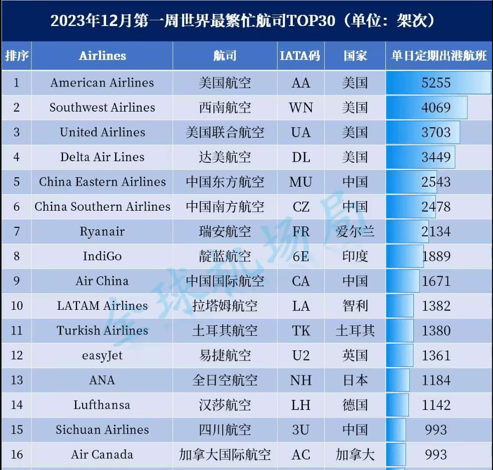 12月初全球最繁忙30大客運(yùn)航司統(tǒng)計(jì)結(jié)果顯示,川航以日定期出港993架次航班排名全球第15位,在國(guó)內(nèi)僅次于三大航,是我國(guó)第四位繁忙的航司。以熊貓?jiān)睾秃娇詹蜑樘厣乃拇ê娇漳赀\(yùn)送旅客量超3000萬(wàn)人次,春運(yùn)期間更是航班數(shù)和旅客量激增。