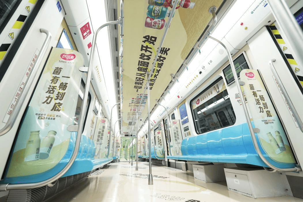 青島地鐵全景品牌專列內(nèi)包車廣告具有廣觸達、深覆蓋、強影響的優(yōu)勢,不僅全面提升了飲樂多品牌形象,更是開啟了品牌傳播的加速度。專列以場景化植入的方式,車廂設(shè)計巧妙的融入了飲樂多產(chǎn)品元素。