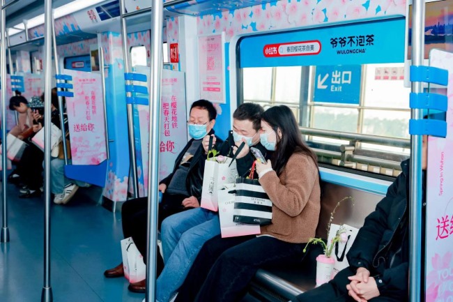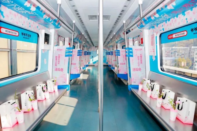 武漢地鐵廣告價(jià)格收費(fèi),武漢地鐵列車廣告內(nèi)外包車廣告櫻花案例圖