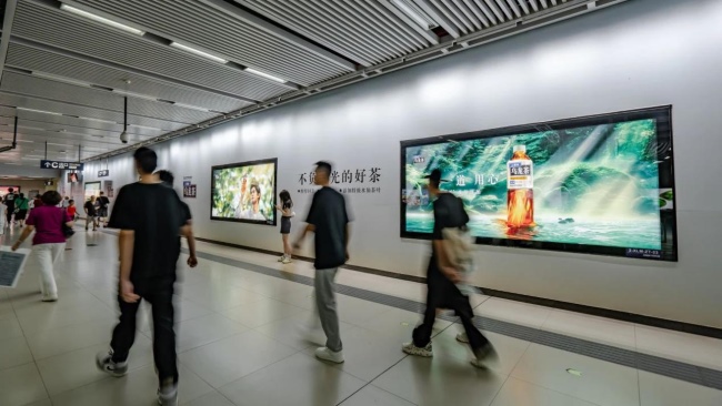 武漢地鐵2號線循禮門站站廳廣告由墻貼、燈箱等元素構(gòu)成,同時覆蓋進站以及出站的密集客流。巨大的墻貼以及呈現(xiàn)發(fā)光效果的燈箱等廣告形式在循禮門站與眾不同的站廳換乘區(qū)域形成巨大的品牌空間,連續(xù)的品牌長墻可承載更豐富的內(nèi)容,超長時間吸引往來乘客注意力,以超高的存在感搶占客流視線,形成品牌記憶。
