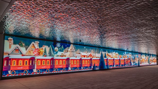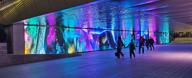 蘇州水上光影長廊LED大屏廣告36米超長橫屏形成“視覺長廊”,4K動態(tài)畫面配合橋底弧形結構,營造包裹式觀感,夜間亮化后可視距離超500米,品牌記憶度較普通LED提升60%。北岸連廊連接圓融天幕東街與西街(日均客流量超8萬人次),南岸連廊直通久光百貨與圓融廣場(日均客流量超10萬人次),LED橫屏橫跨36米,雙屏展示覆蓋雙向客流。