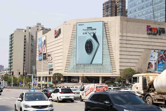 長沙王府井百貨主屏LED大屏廣告地標(biāo)占位,384㎡巨幕形成河西制高點,500米外清晰可辨,144㎡屏體輔屏近距補充,針對路口緩行車輛及行人。金星大道南北向車流直面主屏,桐梓坡路東西向車流及過街人流同步觸達(dá)輔屏,消除視角盲區(qū)。